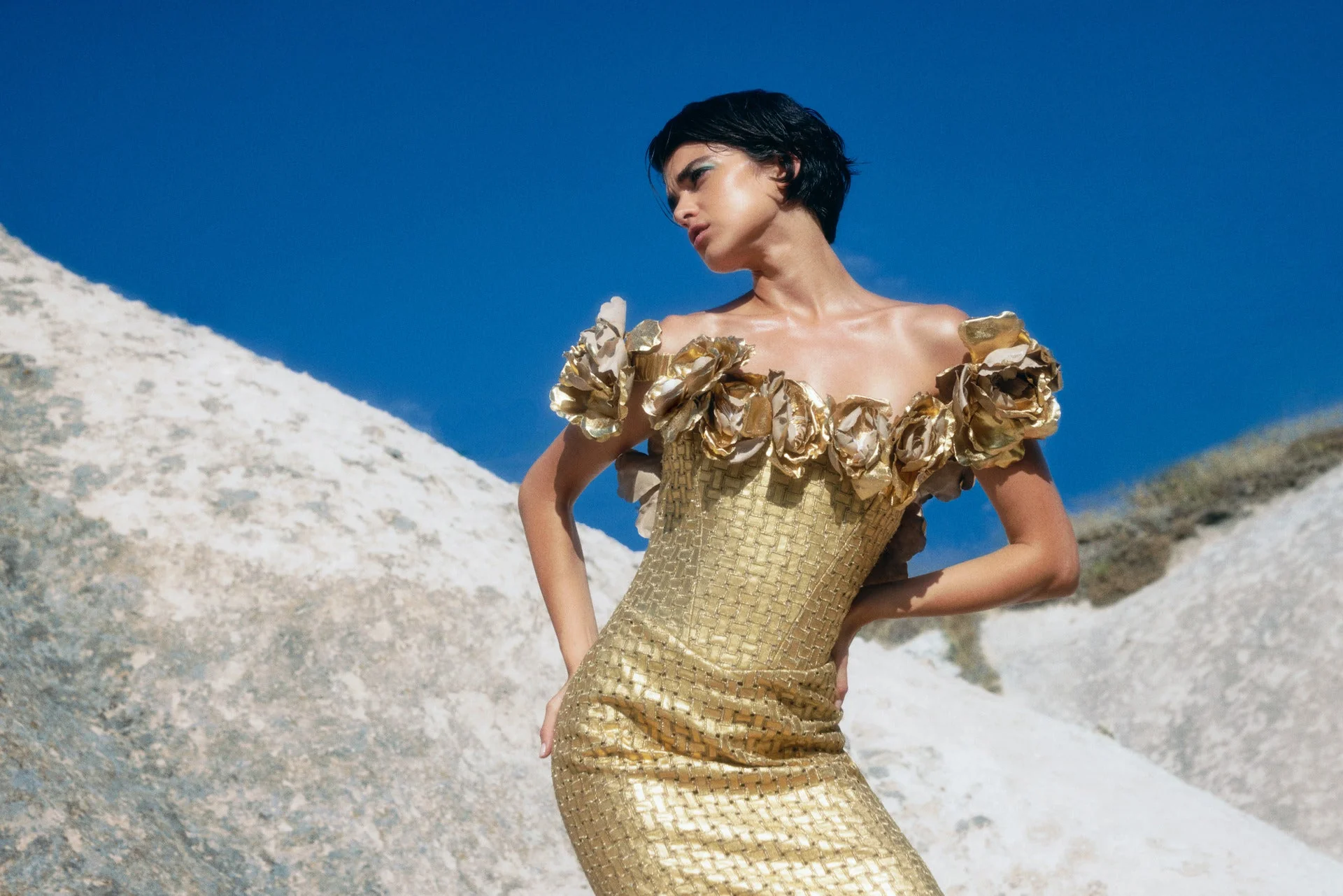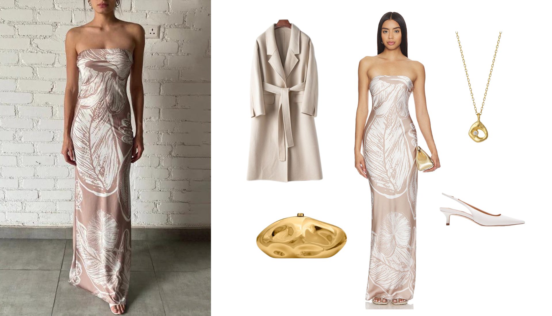 Pair the Ines Strapless Dress by Rococo Sand with a structured camel coat and pointed-toe kitten heels for a chic and effortless look, perfect for day-to-night transitions.