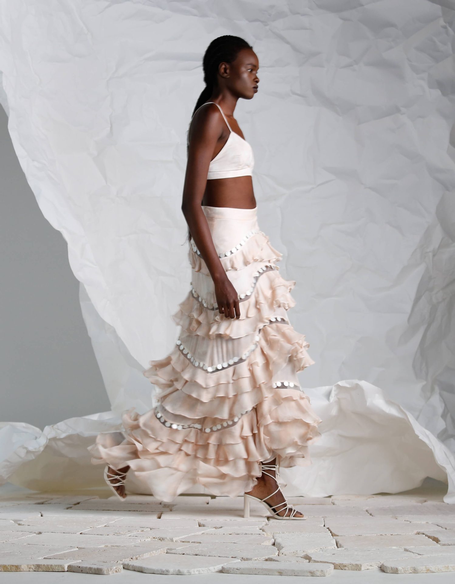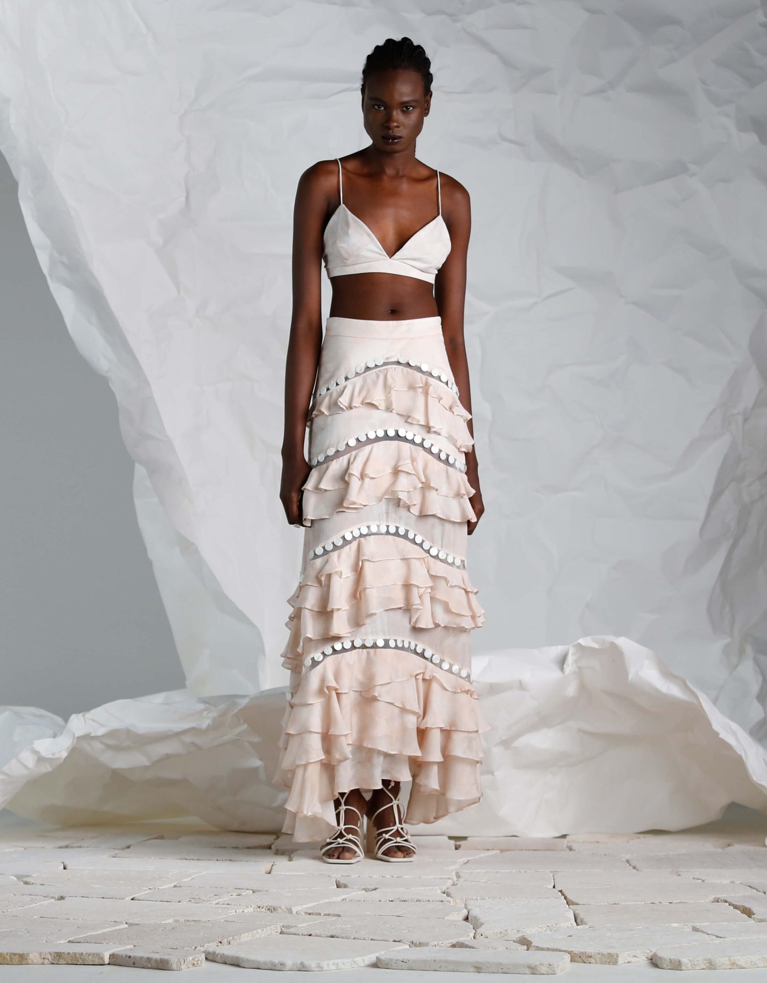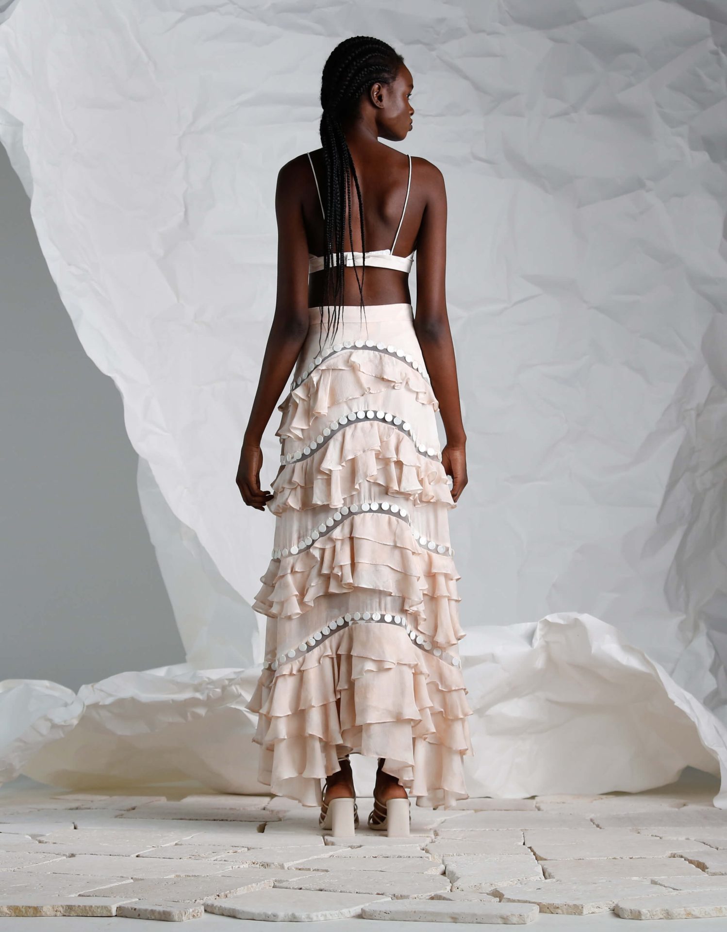Flowing from the waist is the multi-tiered skirt, where each layer is lovingly crafted with ruffles that float with every movement, creating a ballet of texture and form. The shell embellishments continue along the trim of each tier, adding a consistent theme that ties the set together with a touch of the unexpected.