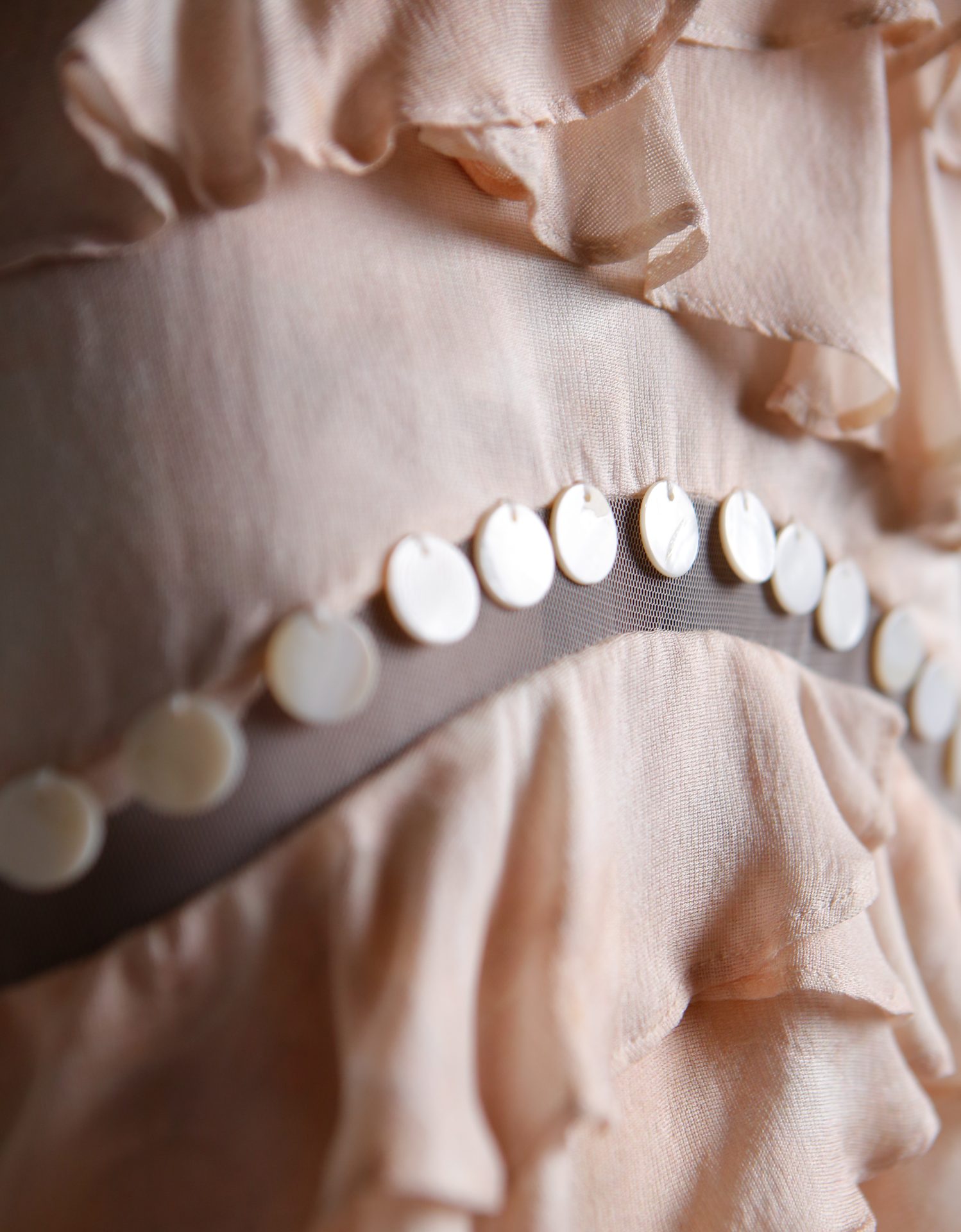 - Sheer mesh panels are all finished with hand-applied shell beadwork.