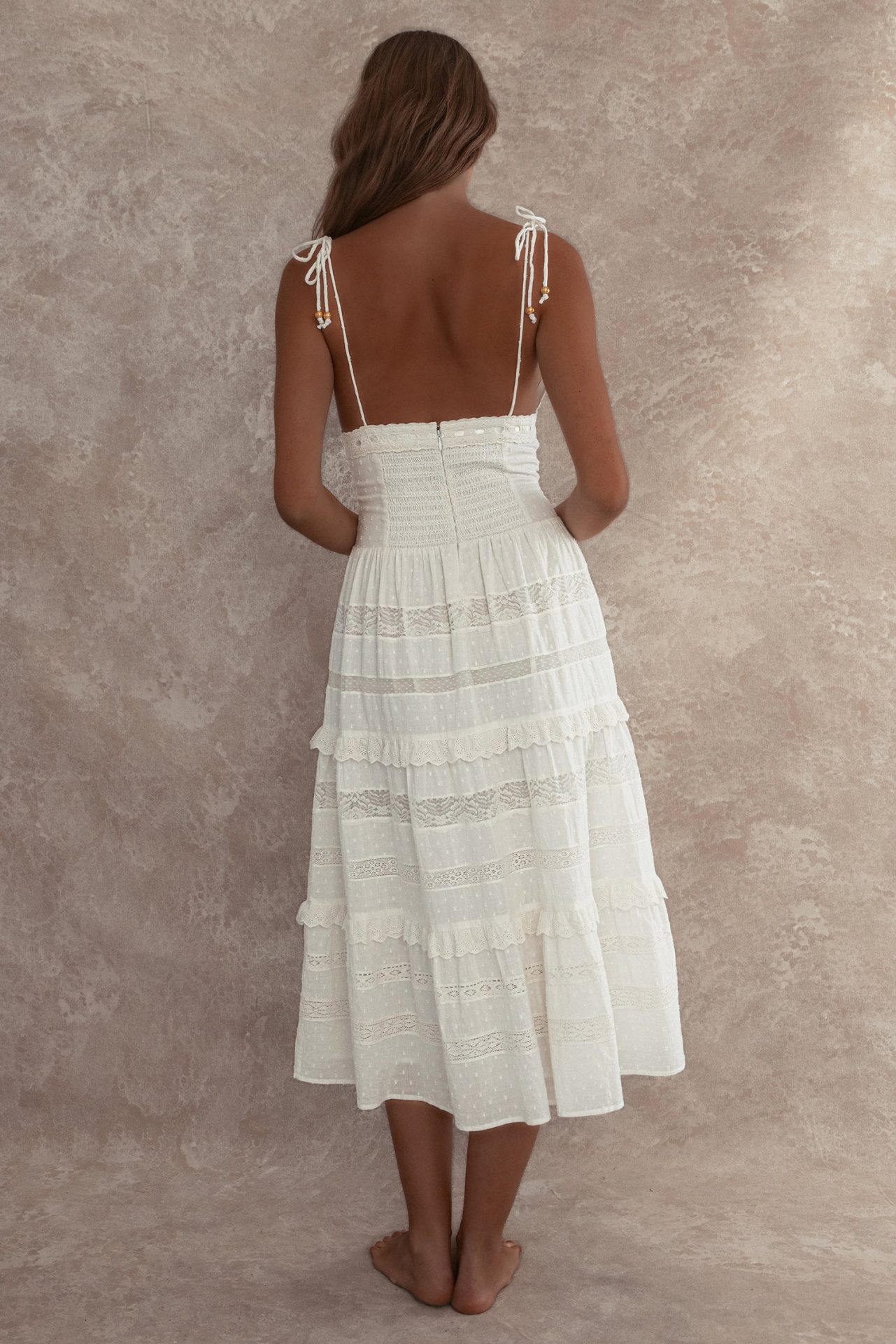 The Heather Shoulder Tie Maxi Dress by Fillyboo exudes an ethereal boho-luxe vibe. Crafted with intricate lace detailing throughout, this dress showcases a smocked corset-style bodice that enhances the waist while offering a comfortable, flexible fit. The adjustable shoulder ties add a soft, feminine touch, allowing you to customize the fit, while the button-front detail adds vintage-inspired charm. The tiered skirt moves with effortless grace, making it a perfect choice for garden parties, resort vacations, or romantic getaways.