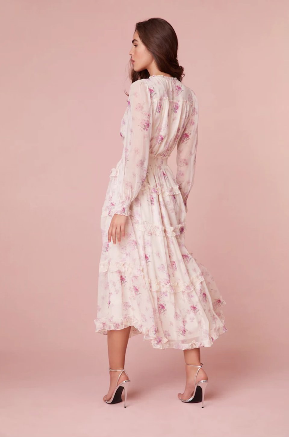 Kailo Dress by LoveShackFancy The Kailo Dress is stunning in its delicate chiffon fabric with a flower design reminiscent of French antiques. The evening maxi dress features long blouson sleeves, a fake wrap bodice, a v-neck that falls to a smocked elastic waist, and shirred tiers at the skirt with ruffles attached at the top that add a dreamy, textural touch.