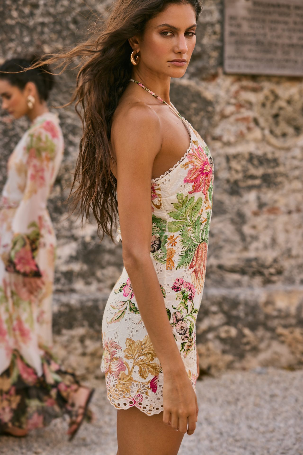 Embrace the season with the Pahi Mini Dress by Hemant & Nandita, a stunning blend of playful charm and elegant sophistication. This dress showcases a vibrant floral print in rich, earthy tones, creating a lively and captivating look. The chic halter neckline adds a touch of modernity, while the delicate lace trim along the edges brings a soft, feminine finish. The form-fitting silhouette enhances your natural curves, making this dress ideal for summer outings, garden parties, or any occasion where you want to feel confident and chic.