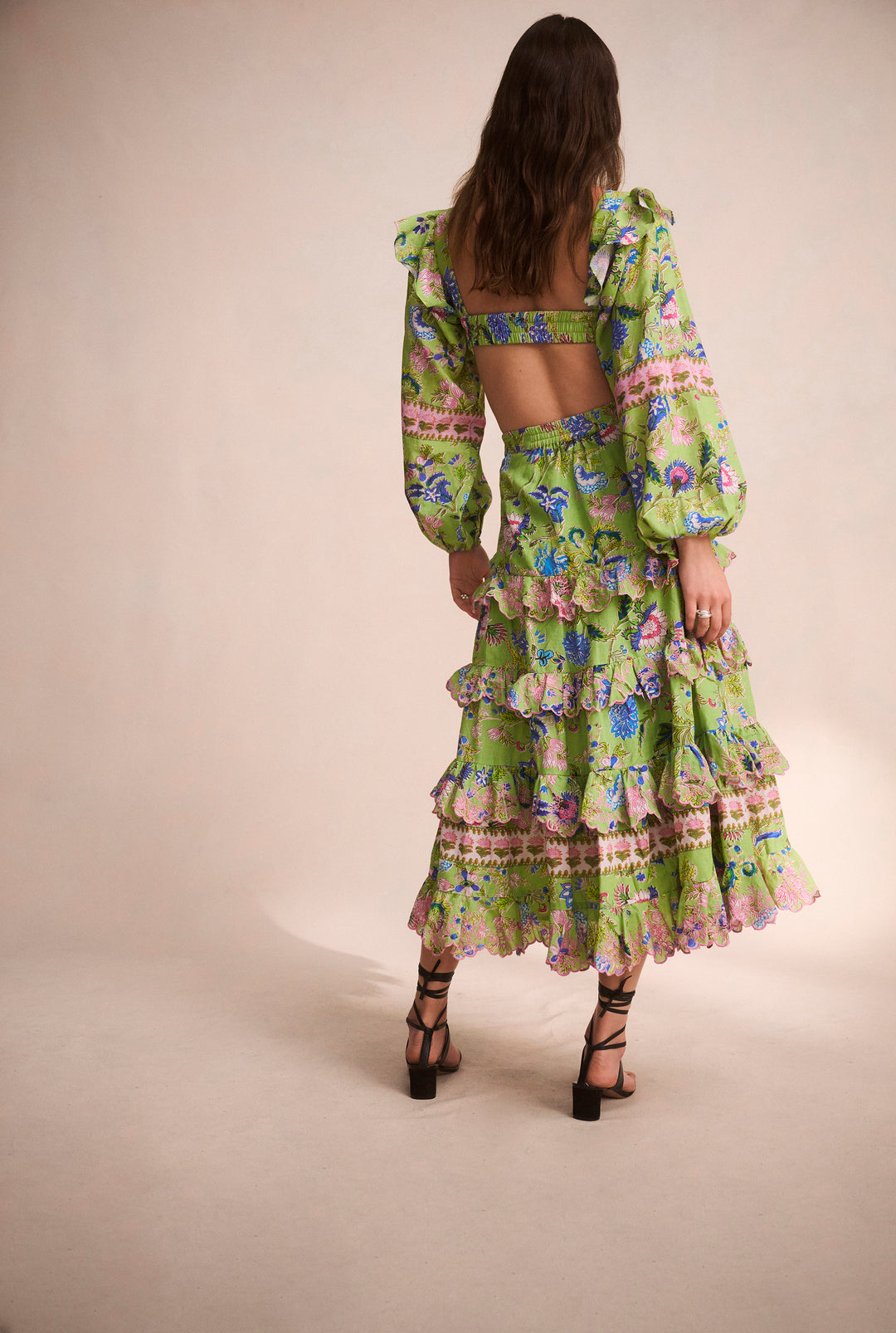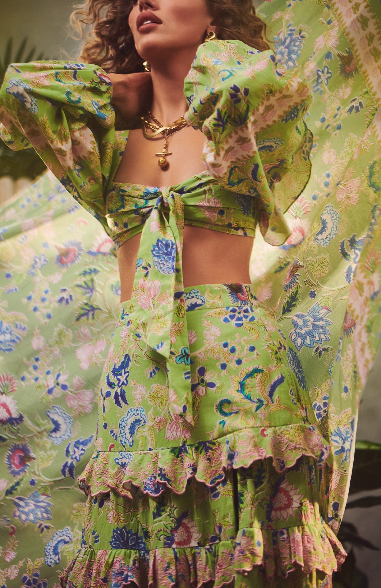 The Rhea set features a beautiful and elegant floral pattern on a pear green colour. Beautiful bishop sleeves with a sweetheart neckline and midi length skirt with a side slit. The ruffle accents add volume and fun to the style and the side slit allows for ease of movement and comfort on warm destinations.