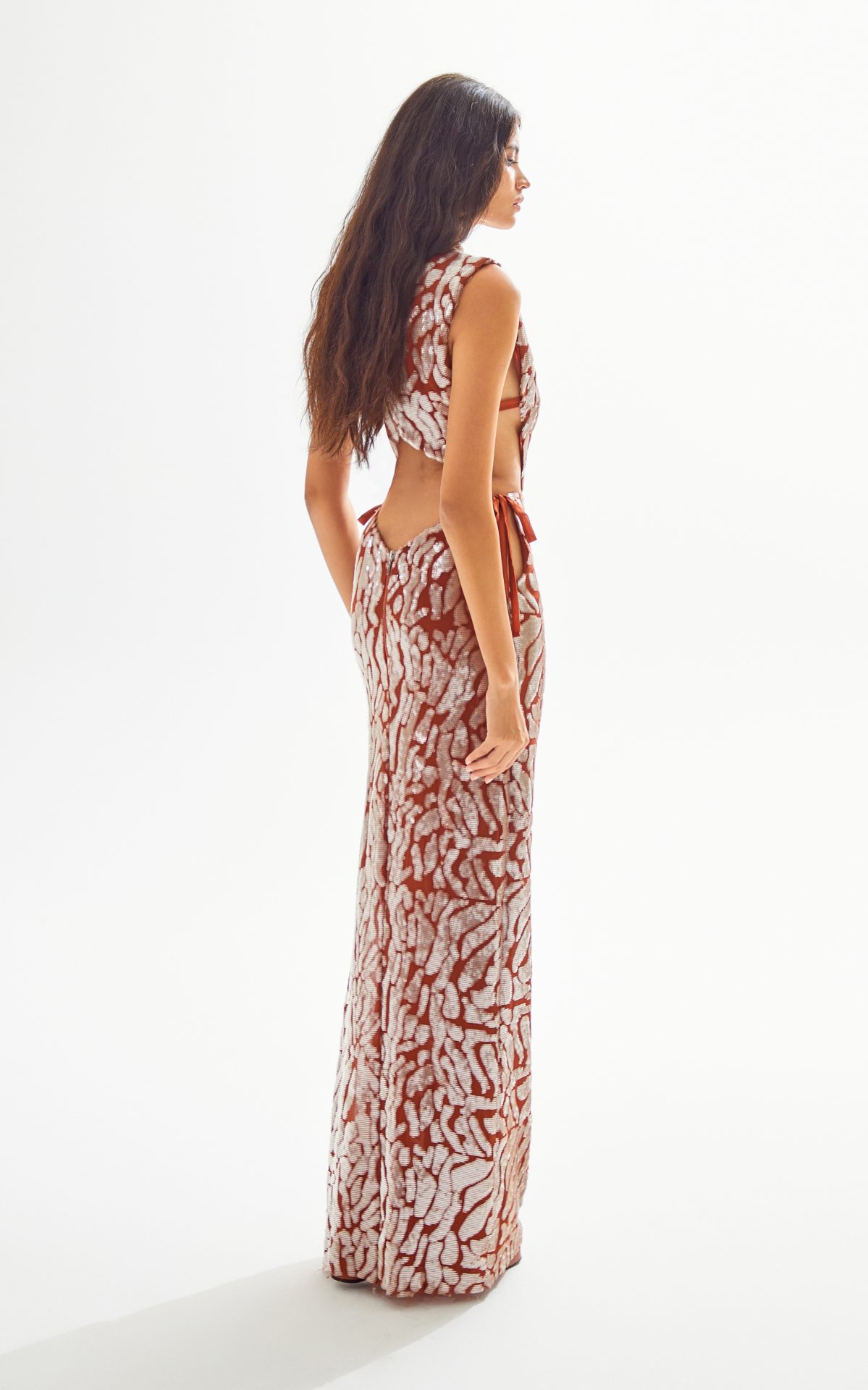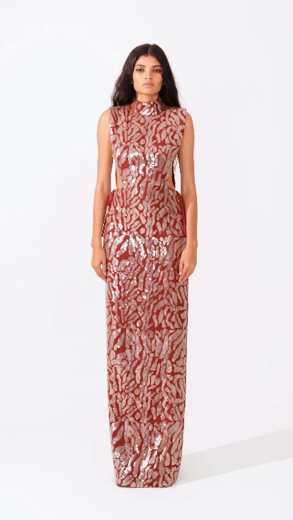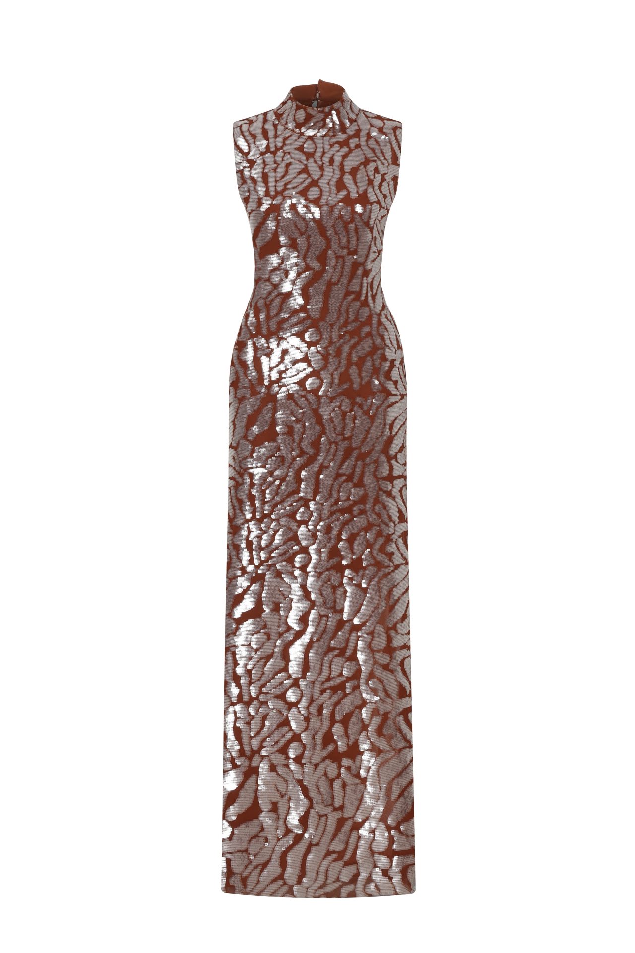 This high-end designer piece is a perfect blend of elegance and modern edge, making it an essential addition to your luxury wardrobe. The dress features a sophisticated high turtle neck and a unique cut-out design on the sides, creating a captivating silhouette. The intricate fabric detailing in a beautiful burnt copper base tone adds depth and texture, ensuring you stand out in any crowd. Ideal for upscale events where a sophisticated yet edgy look is desired.